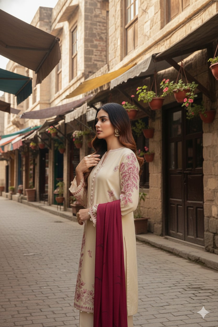 ▶️Grace and comfort with this elegant linen kurta set, beautifully crafted in a soft butter-yellow hue and adorned with delicate red embroidery. The intricate threadwork on the sleeves, hemline, and neckline adds a refined charm, while the breathable premium linen fabric ensures ease and comfort throughout the day.